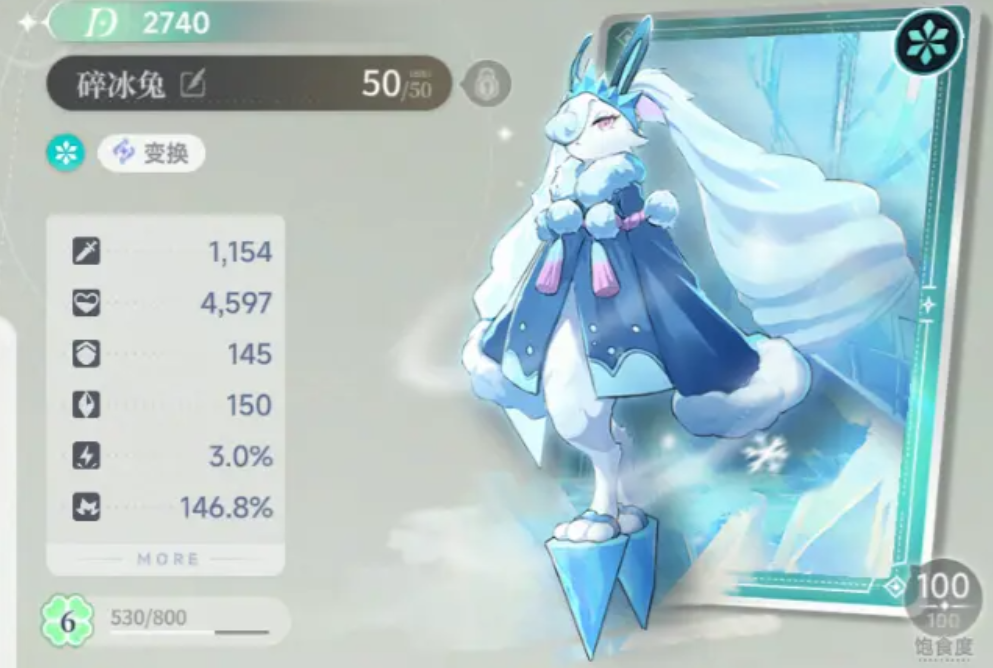 首先介绍的是碎冰兔,这只精灵可谓是游戏中的明星角色之一。作为一只幻想类型的精灵,碎冰兔拥有强大的魔法能力,能够切断各种水晶。在战斗中,碎冰兔的身体会发出耀眼的蓝光,给敌人带来视觉上的干扰,简直就像是游戏中最炫酷的特效。碎冰兔分为三个阶段,前期形态为雪容仔,玩家可以在寒晶铃地区捕捉并培养。在捕捉之前,玩家需要与其战斗,将其生命值压至最低,才能提高捕捉的成功率。若能将其培养至20级,将自动进化,40级时则化身为强大的碎冰兔,成为你战斗中的得力助手。